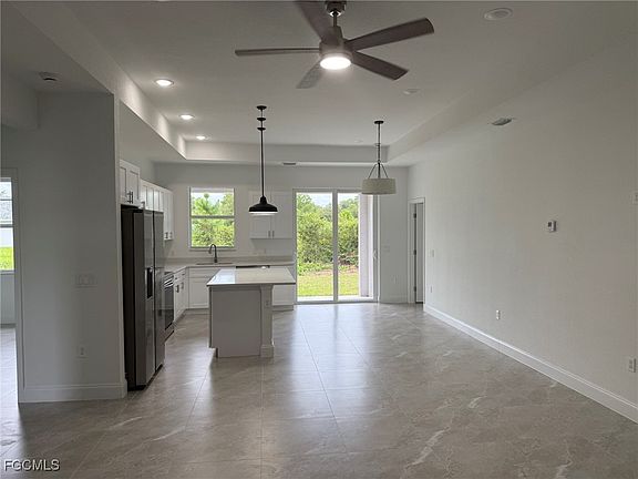Stunning new construction – move-in ready 3-bedroom, 2-bath home with double garage and lanai in a prime East Lehigh location. This brand-new home features a bright open-concept layout with high ceilings and elegant step accents. Built with impact-resistant windows for added safety and energy efficiency. The kitchen and bathroom vanities are finished with quartz countertops, stainless steel appliances, and porcelain tile flooring throughout. The home also features designer lighting fixtures and modern ceiling fans with lights in every bedroom. A spacious laundry room with utility sink adds extra convenience. The spacious master suite includes dual walk-in closets and a spa-style bath with double sinks and a large walk-in shower. Located just 15 minutes from Southwest Florida International Airport and the prestigious Florida Gulf Coast University, with easy access to Fort Myers and I-75. Close to top-rated schools, shopping, and dining. Schedule your showing today!