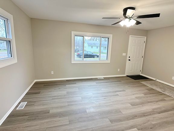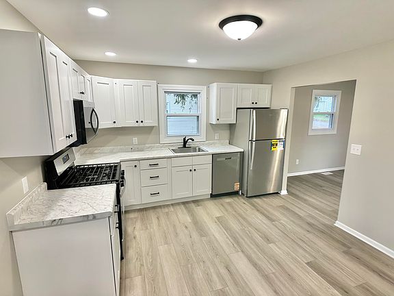 Professionally remodeled throughout, this home is sure to please. Walking in the back door you will first notice the extra-large kitchen featuring new oft close cabinets, countertop, stainless appliances, wide plank vinyl flooring and plenty of canned lighting. From the kitchen, you will enter a nice sized living room with plenty of room for entertaining. A short hallway leads to 2 bedrooms, a large, finished utility room with extra room for storage and a fully updated beautiful full bath. Additional new items include, roof, vinyl siding, all interior doors, knobs, window trim, baseboards, lighting, fixtures, vinyl flooring, carpeting, professionally painted, garage door opener and blown-in attic insulation. The furnace, AC and Hot Water Heater are just a few years old. Just move right in and enjoy your new home.
