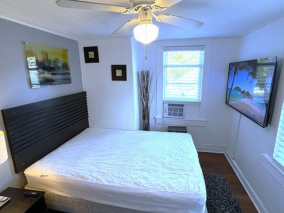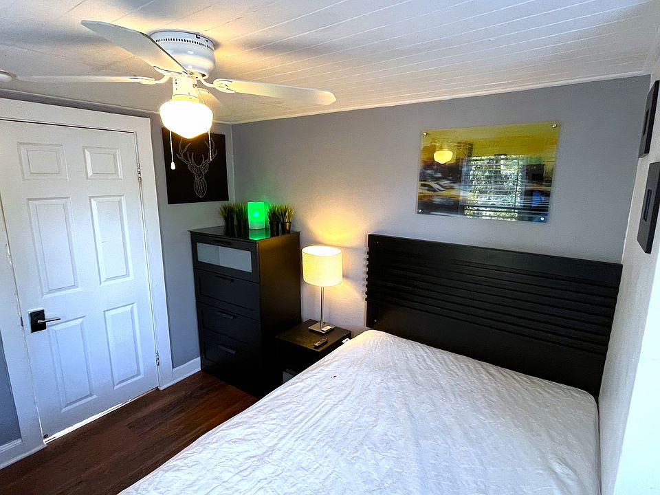 Small private bedroom in small shared apartment on second floor. Room features 65" Roku smart TV, full bed, computer desk, desk chair, and modern furniture. Kitchen, bathroom and laundry are shared with other tenants. Convenient Daytona Beach location. Fully furnished as shown in pictures and all utilities included in the flat rate monthly rent. Room is for one person only, NO Pets, No Smoking, No Excessive Drinking, No Drugs, and No Slobs. You must be ok with keeping the apartment clean and picking up after yourself. If you are a messy person this is NOT the place for you. This is not a party apartment for having people over frequently. No more than one guest allowed over once per week. Month by month, move out anytime with 30 days notice. Reservation fee plus first months rent moves you in.