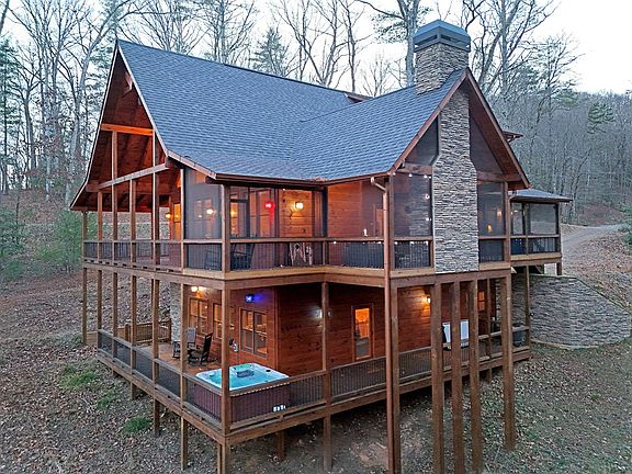 Nestled within the exclusive, gated community of Noontootla Highlands in the Aska Adventure Area, this remarkable mountain retreat seamlessly blends refined luxury with timeless rustic charm. Situated on 8.01 private acres, this 3-bedroom plus loft, 3-bath cabin offers peaceful year-round mountain views from nearly every vantage point. Crafted with hand-hewn log siding, the home welcomes you with rich wood floors, upscale custom cabinetry, and upgraded granite countertops throughout. The open-concept main level is anchored by a dramatic stacked-stone ventless gas log fireplace, creating a warm and inviting atmosphere. The gourmet kitchen features upgraded granite surfaces and sleek black slate appliances, perfect for both everyday living and entertaining. The main-level primary suite offers a serene retreat with a private ensuite bath, while a convenient half bath with laundry completes the level. Outdoor living shines with wrap-around porches and a screened party porch featuring a wood-burning stacked-stone fireplace, ideal for cozy evenings overlooking the mountains. The finished terrace level is designed for entertainment and relaxation, showcasing a game area, great room with stacked stone fireplace, sizeable wet bar and a terrace-level hot tub, all framed by even more great mountain views. This exceptional property provides ample room to build a guest house or garage, offering the flexibility to tailor the estate to your vision. Surrounded by towering hardwoods and tranquil mountain scenery, it is ideally suited as a private mountain escape, luxurious vacation retreat, or desirable investment, where cozy evenings, refined comfort, and the natural beauty of the mountains come together effortlessly.