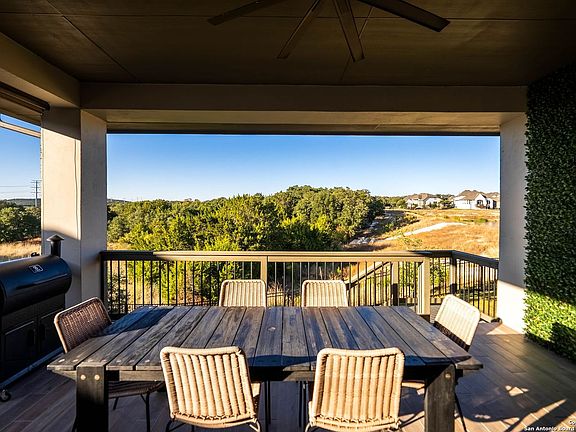 Welcome home to a beautifully crafted single-story Perry home tucked inside a quiet gated community, where every day feels like an escape into Texas Hill Country living. From the moment you step inside, the soft glow of the electric fireplace invites you to imagine cool fall evenings wrapped in a blanket, sipping hot cocoa while watching your favorite show. It is the kind of warmth that makes a house feel like home. The open-concept kitchen is designed for real life. A center island plus a peninsula island means there is always room for everything that happens in a busy household or relax with morning coffee chats, kids doing homework while dinner simmers, friends gathering around for game nights, and that one family member who never leaves the snack bar. Upgraded fixtures and finishes bring just enough luxury to elevate everyday moments. And with wood-look tile throughout and no carpet, life stays clean, simple, and stress-free, even on those muddy-paw, post-soccer-practice days. A formal study sits peacefully at the front of the home, ideal for focused work sessions, Zoom meetings, or transforming into the quiet reading room you have always wanted. At the end of the day, step into your backyard and take in the greenbelt and country views. A calming reminder that you live somewhere special. The privacy, the open sky, the sound of wind moving through the trees... it is the kind of backdrop that resets your mind after long days. Living here means unlocking a lifestyle many dream about. You are just a golf-cart ride away from Herff Ranch Elementary in Boerne ISD, making school drop-offs effortless and even a little fun. Spend weekends floating down the lazy river, letting the kids burn energy at the dog park, or exploring scenic walking and biking trails that wind through nature. And the amenities are unmatched: an 11-acre private club, modern fitness center, upcoming pickleball courts, sand volleyball, multiple resort-style pools, a food-truck court, live music lawns, and more. Every day here feels like a vacation that never ends.