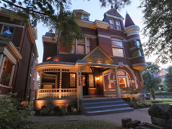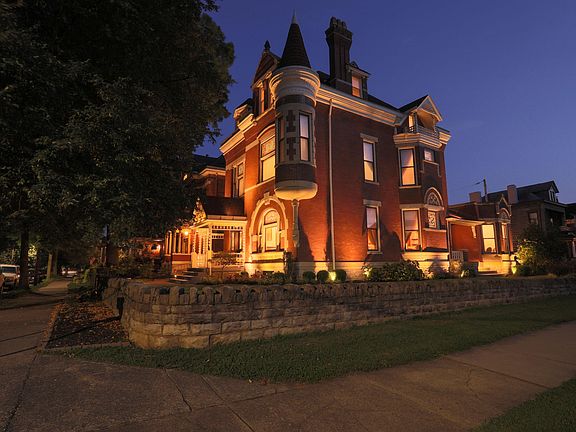 Queen Anne Masterpiece on Mansion Hill's Most Prestigious Block! A rare opportunity to own this commanding three-story brick Queen Anne, perfectly positioned on a corner lot in the East Row Historic District—just steps from everything. Featuring a turret, wraparound porch, balconies, impeccable landscaping, and exterior lighting, the home radiates timeless beauty. Fully renovated in 2018 with new mechanicals, wiring, plumbing, and dual HVAC, it blends historic character with modern luxury. Inside: 12' ceilings with crown moulding, restored fixtures, original stained glass, pocket doors, six fireplaces with Kensington tile, and an intricately detailed staircase with Lincrusta wallcovering. The chef's kitchen includes a bay window breakfast nook, Italian Bertazzoni appliances, quartz and wood counters, butler's pantry with wine fridge, and abundant storage. Upstairs, the primary suite offers a spa-like bath with soaking tub, oversized shower, and massive closet. Additional bedrooms, office, family/media room, and laundry provide comfort and function. Outdoor living features a private courtyard, outdoor kitchen, 2-car garage with EV charger. Tall-ceiling basement for extra storage.
