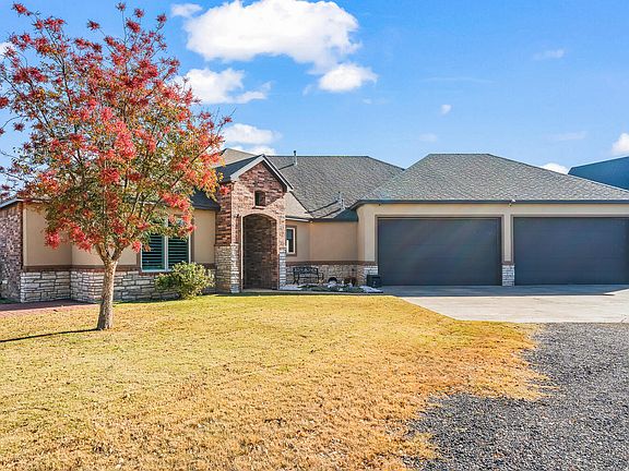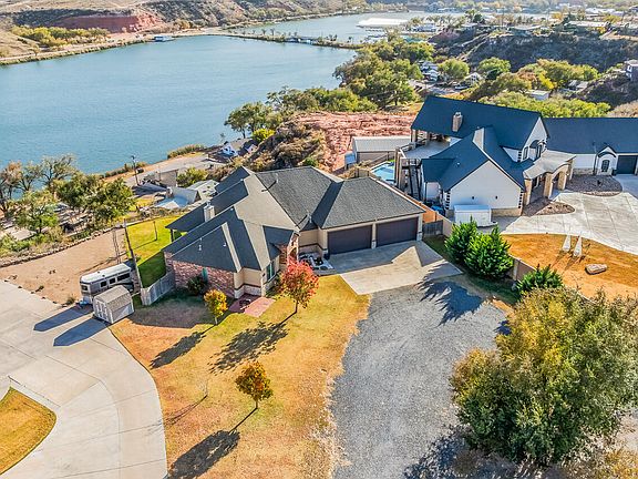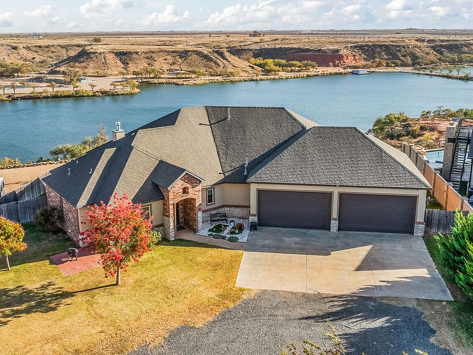 Discover one of the most desirable cliffside homes at Buffalo Springs Lake, offering panoramic water views from sunrise to sunset. This rare property sits high above the lake with an expansive covered patio designed for both comfort and scenery—perfect for entertaining without ever losing the view. Inside, the open-concept living room features large windows that frame the water beautifully, creating a seamless connection between indoor and outdoor living. The kitchen opens directly to the living area and fireplace, making the entire space ideal for gatherings. The master suite overlooks the lake and includes a spacious ensuite bath, walk-in closet, and convenient access to the laundry room. Two additional bedrooms and a large full bathroom are located on the opposite side of the home for added privacy. A whole-house generator provides year-round reliability and peace of mind. Outside, you'll find a generous yard, elevated vantage point for the annual fireworks show, and a rare four-car garage — a level of convenience seldom available at the lake. This is a truly special opportunity to own a cliffside home with some of the best views Buffalo Springs Lake has to offer.