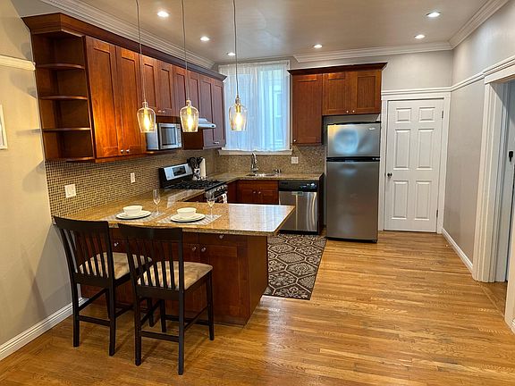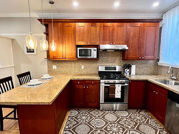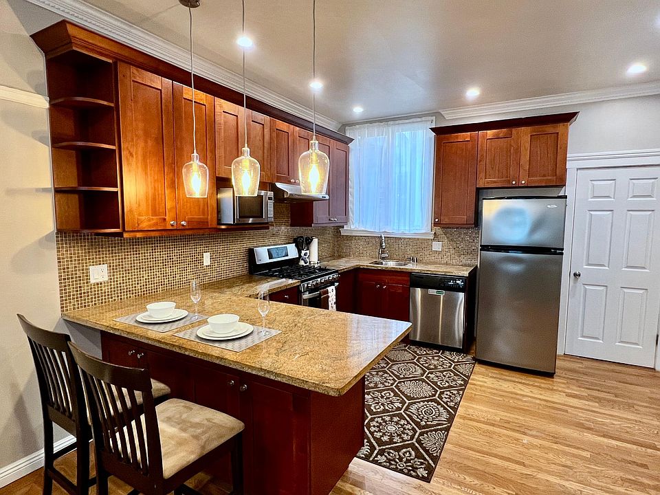 Hardwood floors throughout + large, beautiful kitchen with marble countertops, pendant lights and newer stainless steel appliances.