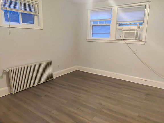 Laminate flooring installed throughout. Apartment includes: large living room with three large windows, window A/C unit and radiator heat, large walk-in storage closet with built-in shelving (great as a coat closet); large kitchen with vintage touches including an original farmhouse sink, nice cabinetry with lots of added interior shelving. Spacious kitchen area, large pantry with ample shelving. Recently updated electric range, full-size refrigerator; nicely sized master bedroom with full size closet has two windows and gets lots of natural light; 2nd bedroom which could also function well as an office or studio space; comes with full-size closet, and door which functions as a 2nd exit as well as access to the laundry room; bathroom comes with recently updated sink/vanity, freshly re-grouted/sealed black and white tiled full size shower/original enamel tub, added shelving.