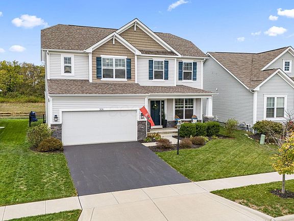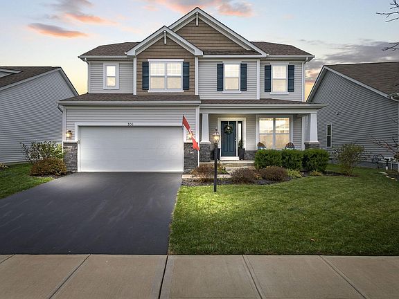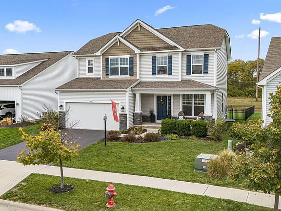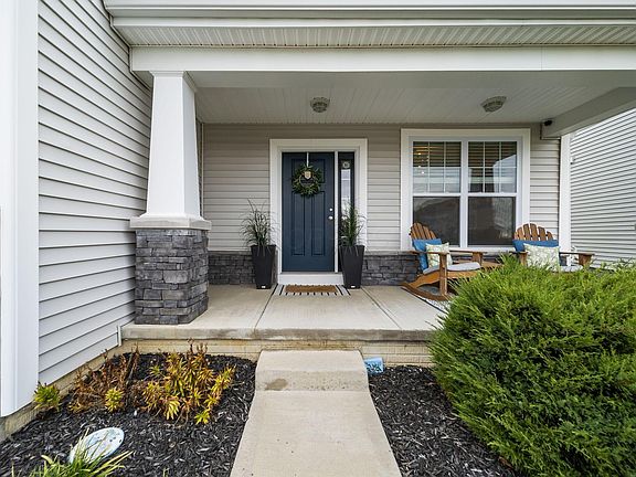 Beautifully maintained 2-Story home with cozy porch on quiet cul-de-sac in sought-after Darby Fields! This 3BR/2.5BA home sits on a fenced lot backing to pond guaranteeing no rear yard neighbors ever! Durable, easy-care LVP flooring throughout the first floor. The main level features a flex room with glass privacy doors perfect for a home office or formal dining room. The bright, spacious living room opens to a modern kitchen with quartz countertops, breakfast bar, island, stainless steel appliances, gas stove, and a separate eat-in area with bump-out, Upstairs, you'll find a large loft and a vaulted-ceiling owner's suite complete with a double-vanity bath, walk-in glass shower with bench, and walk-in closet. Two additional nicely sized bedrooms plus a second-floor laundry room for added convenience. Ceiling fans in every room and custom Graber 2' slat blinds throughout. The full unfinished basement includes a rough-in for a full bath and egress window ready for a future bedroom or additional living space. Enjoy the outdoors on the large deck overlooking a fully fenced yard that backs to open green space and a serene pond. Hurry to see this one! Sought after established community with walking path to elementary school!