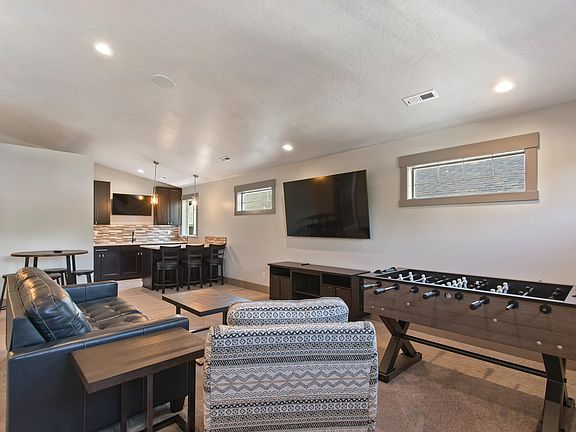 Upstairs, you will find the game room! Hang out with your whole family with endless entertainment including a foosball table, shuffleboard, a bumper pool/card table & a TV. Bring your game console to use on the big screen TV in the game room. Plus, the space has lots of seating and its very own wet bar! There also is a state-of-the-art sound system throughout the whole house. You are guaranteed to make some memories up here when you are not exploring CDA!