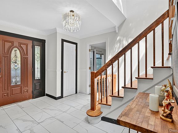 This well maintained and over sized cotemporary Colonial is located in the award winning Nanuet school district. With high Cellings and Skylights throughout this spacious home features many updates including a beautiful open kitchen with high end appliances and quartz counter tops. New heating system installed in 2023 with 2 heating zones, 2 new central AC with 2 Zones, A brand new second kitchen added with CO. Other updates includes new paver patio, new electrical panel and circular drive way all completed in the past 3 years. Huge master bedroom with en-suite featuring a steam shower and jacuzzi tub. This 5 bed room and 4 full bath house with additional bonous rooms is ideal for large or extended family The house is also equped with Solar panel resulting in low energy bill. The house is located in the center of Nanuet, very close to all major highways, bus stops, train stations, shops and restaurants. The large circular drive way can accomadate plenty of cars. Sold as is.