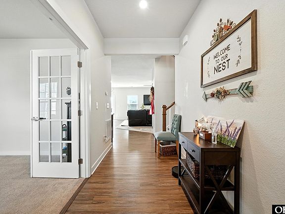 Additional features include durable LVP flooring in the foyer, kitchen, and dining areas, tile floors in all bathrooms, carpet in the living room, a flex space, and in bedrooms, a tankless water heater, a water softening system, and zoned heating and cooling.