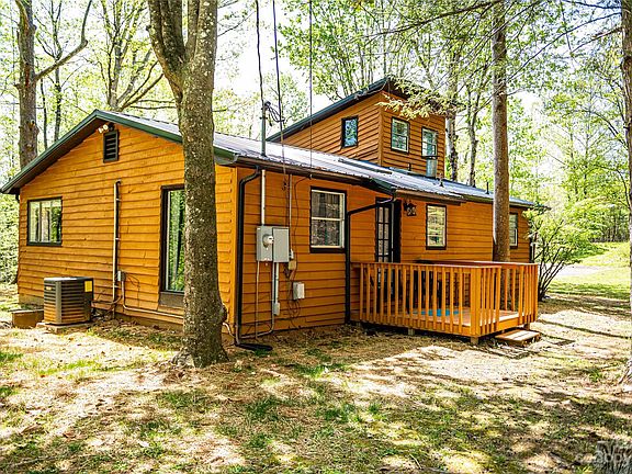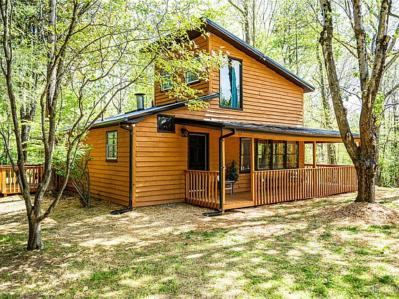 Lake James community living! Contemporary cabin features open floor plan, split bedroom plan downstairs with large windows to enjoy your secluded backyard view, primary bedroom has vaulted ceilings. Dining room with stained glass accents. Kitchen with wood beams and metal ceiling, new stainless steel smooth top range, refrigerator, dish washer, and hall pantry. Living Room has vaulted ceilings and open floor plan to the kitchen. Bathroom has built in storage, wood vaulted ceilings, laminate/tile floors, stained glass, laundry closet, and access to the semi wrap around covered porch. Spacious upstairs bedroom with large windows, stained glass window, and wood beam ceiling. Enjoy porches on three sides of the home or cozy up by the fire pit in the backyard. Located 2-5 minutes from several lake access areas, minutes to I-40, Table Rock, Fonta flora Trail, Fonta Flora at Whippoorwill Farm, Linville River, Linville Gorge, and Shortoff Mountain. Airbnb, secondary, or primary home ready!
