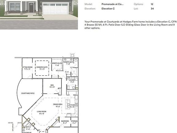 This luxury ranch home features the expertly curated Portico floor plan. Spacious owner's suite, large closet, bright second bedroom, den with glass doors and a gorgeous private courtyard. Our homes are designed to make your life easier and more enjoyable. The Courtyards at Hodges Farm has quick roadway access to nearby I-485 and I-85. Located near UNC Charlotte and University Research Park. The majority of the homes back up to a mature tree line or green open space. This quick move in home will be available in December.