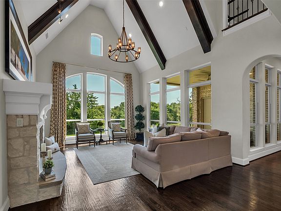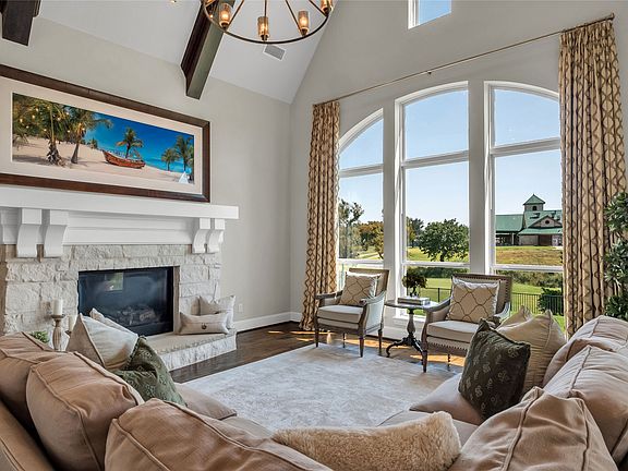 Luxury living meets golf course perfection in this Huntington Home overlooking the 1st Tee Box and tranquil lake at Gentle Creek Golf Course. 5 bedrooms all with private ensuite bathrooms, 3 powder baths, and a 4-car garage on a 0.394-acre premium golf course lot. Soaring vaulted beam ceilings, a cozy gas log fireplace, and expansive windows create a light-filled living space with unbeatable views. The gourmet kitchen boasts quartz countertops, a farmhouse apron-front sink, Sub-Zero refrigerator, Wolf 6-burner cooktop, and a prep area with walk-in pantry. The primary suite is a private retreat with bay windows overlooking the course and a spa-like bath featuring dual vanities, a freestanding tub, oversized walk-in shower, and an fabulous walk-in closet that connects directly to the utility room with sink and additional cabinetry. An oversized front study makes the perfect home office, while a secondary bedroom with ensuite bath is conveniently located on the main level. Dual staircases lead to a game room with wet bar area and balcony views, a media room wired for surround sound, a tech center, and three additional ensuite bedrooms all with walk-in closets and walk-out attic storage. Step outside to a travertine covered patio with pool bath and storage closet. Picturesque golf course views provide the perfect backdrop to the home’s sprawling, landscaped backyard. A 4-car epoxy garage completes this incredible home.