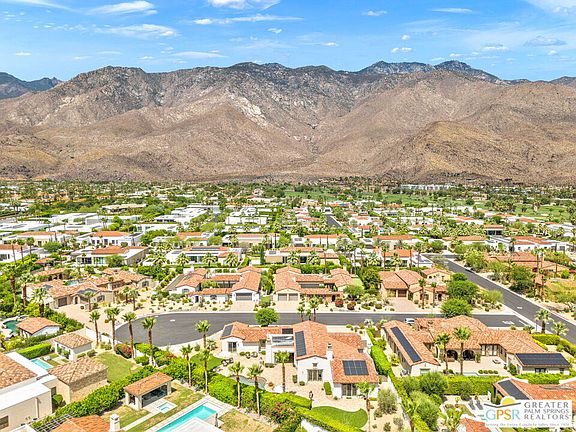Welcome to Monte Sereno, a boutique enclave of estate-style homes in South Palm Springs, where you own the land (fee simple) and enjoy some of the most breathtaking views the desert has to offer. Nestled in a prime location, this 4 bedroom, 3.5 bath residence offers privacy and comfort - all in one beautifully designed package. From the moment you enter, you'll feel the pride of ownership throughout. Owned solar panels provide long-term energy efficiency, while tall ceilings, clerestory windows, and multiple sliding glass doors flood the home with natural light and showcase panoramic mountain views in every direction. The gourmet kitchen is bright and open, featuring a walk-in pantry and seamless flow into the expansive great room perfect for entertaining or simply enjoying the peaceful desert ambiance. There are casual and formal dining areas, and access to the climate-controlled, attached 2-car garage. Step outside to your ultra-private, south-facing backyard a true resort-style retreat. Surrounded by custom pavers and lush, designer landscaping, the pool and spa take center stage against a dramatic mountain backdrop. Outdoor fireplace, built-in BBQ and misting system, too! Inside, the floor plan offers ideal bedroom separation. The Primary Ensuite includes a spacious walk-in closet, dual vanities, soaking tub, walk-in shower, and even a private outdoor patio. On opposite corners of the home, you'll find three more versatile bedrooms. Junior Ensuite Two offers beautiful views and a private bath. Junior Ensuite Three features mountain views and connects to a full bath. Bedroom Four (currently enjoyed as a family/media room) this space offers incredible views, a wardrobe closet, backyard access, and a connected bath making it ideal as a fourth bedroom, office, or bonus retreat. Every inch of this home is designed to celebrate the best of Palm Springs living!