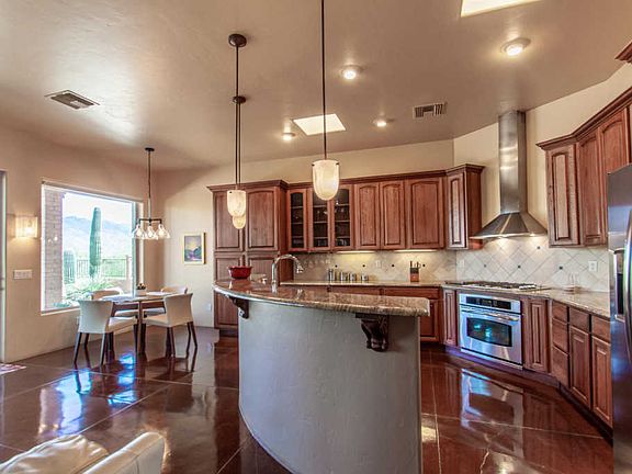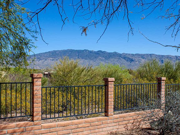 Picturesque Mountain Views from this custom Brick home. Privacy abounds with large covered patio framing the Catalina & Rincon Mountains. Spacious Great Room with custom stone fireplace open to large kitchen. Kitchen boasts an abundance of Rustic Hickory cabinets, granite counters, separate cooktop and convection oven. Newer fridge. Large breakfast bar with pendant lights. Master bathroom has jetted tub, large separate shower, dual sinks granite counters and double closets, Scored concrete floors thruout. Beautiful custom lighting. Large secondary bdrms, solid interior wood doors. Separate office. Large storage area with cabinets, Fully walled front and backyard. Enclosed dog run. Located in private neighborhood at end of newly paved road. Side entry garage. View fencing. Move in ready