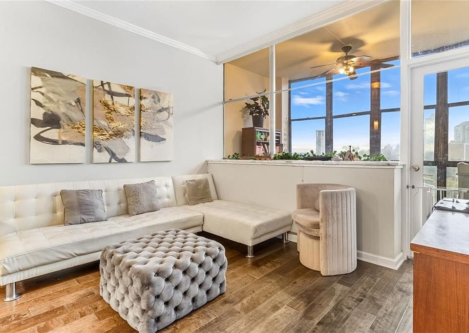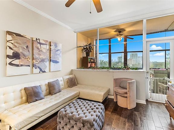 Resort-style poolHigh ceilingsImpeccably updated high-rise condoMaintained groundsBreathtaking floor-to-ceiling city viewsLush gardensAbundant natural light