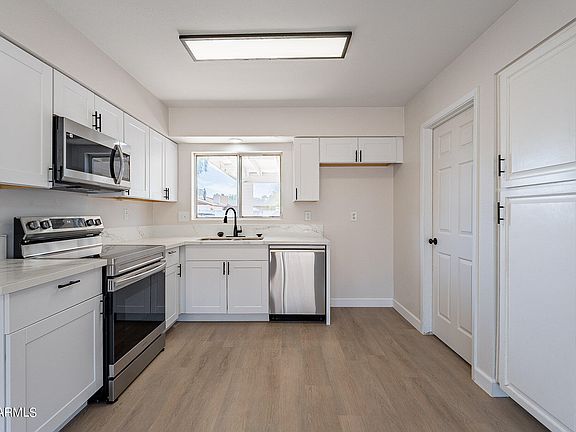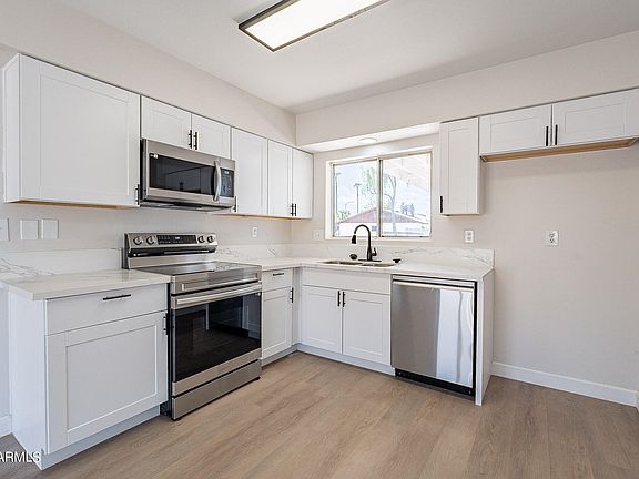 This inviting three-bedroom, two-bath home features fresh exterior and interior paint that enhances its modern appeal. Inside, you'll find new carpet in the bedrooms, providing a cozy touch. The updated kitchen boasts stylish new cabinets, elegant quartz countertops, and a suite of stainless steel appliances, including a microwave, range, and dishwasher, perfect for culinary enthusiasts. Both bathrooms have been refreshed with contemporary vanities, adding a touch of sophistication to the space. This home is ready to welcome you with comfort and style!
