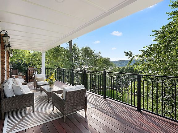 Upon entering the elegant marble foyer, rich with custom millwork and hand-forged wrought iron staircase / railings, one is led into an open-concept living and dining area with full river views, ornamental details , and a fireplace. This space boasts striking views of the Hudson River and opens directly onto a covered terrace sitting area. Plantation shutters and rich wood floors add warmth and sophistication, while oversized windows flood the space with natural light.