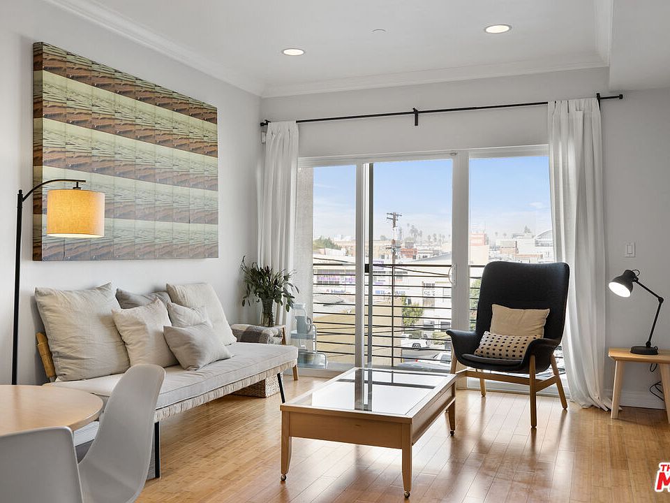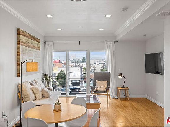 Bright, quiet, and full of natural light, this low maintenance home is both classic and contemporary. Chic details including crown molding, recessed lighting, and gleaming bamboo floors grace the open concept living and dining room. The chef's kitchen shines with stainless steel appliances, granite countertops, and warm maple cabinetry. North-facing sliding glass doors open from the living room onto a broad balcony, showcasing views of the mountains and the Hollywood sign. The primary suite comes equipped with a walk-in closet with built-in organizational systems and a marble-floored bath. The second bedroom features its own private balcony, excellent for a coffee break in the sun while you work from home. At just under 1000 sf, Unit 307 was designed with ease in mind. The building includes a courtyard, communal BBQ patio, and secure gated underground parking with two spots allotted to the unit and plenty of guest parking. This centrally located building with very reasonable HOAs is surrounded by excellent dining, offers quick access to the 10 for an easy commute, and is just moments from DTLA, USC, and Larchmont Village.