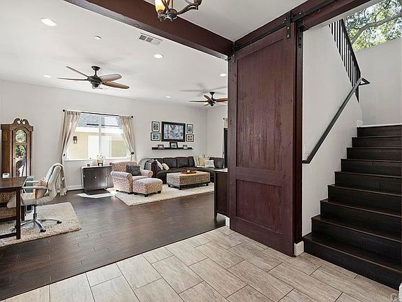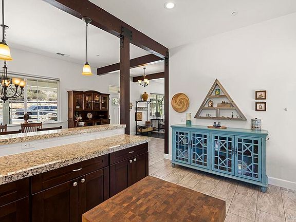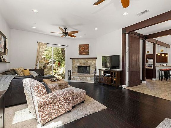 Priced at $849,900-$879,900. Modern and spacious 1,840 sq. ft. 3 bedrooms, 2.5 bathrooms, two-story home with detached two-car garage and separate 120 square foot office on beautifully wooded 1.76 acre fully-fenced lot. This custom home features a tranquil natural setting with seasonal creek views outdoors, vaulted ceilings, wood beams, and a spacious open floor plan inside. The interior has a neutral color scheme with 10-foot ceilings, custom tile, wood flooring throughout, and a gas starter wood burning fireplace with natural stone surround. House features recessed lighting and ceiling fans in main living space and all bedrooms. Subway tile backsplash beautifully accents the granite countertops and shaker cabinets in kitchen. The master suite is a sanctuary with private views of oak trees and is complete with an en suite bathroom with walk-in shower. Master also features a walk-in closet with custom shelving and a separate custom built-in closet system. The second bedroom features a full-wall custom built-in with two separate dressers and plenty of shelving for all your storage needs. The third bedroom features a beautiful and tranquil view of the oak trees and hills beyond. Outdoor living is easy with a multi-level concrete patio built right into the natural rock formations and taking advantage of views across the valley. Oak trees provide shade alongside the pergola perfectly suited for relaxing with friends and family. Enjoy mature bougainvillea, jade, rosemary, succulents, and more, hand-placed among the rock formations and low-maintenance desertscape. The property’s other focal point is a recently constructed modern separate office/man cave/she-shed/game room with its own concrete patio to enjoy. Structure is fully insulated and drywalled with ductless HVAC, wired with electricity and internet, with recessed lighting, French doors, and frosted rear windows. Property has seasonal creek access and room to make it your own with horses, toys, boats, and more. Recently-painted exterior with updated rain gutters, semi-circular drive and automatic gate. Close to nature preserves, shops, dining, and minutes to Interstate 15. Country living doesn’t get finer than this – don’t let this opportunity pass you by!