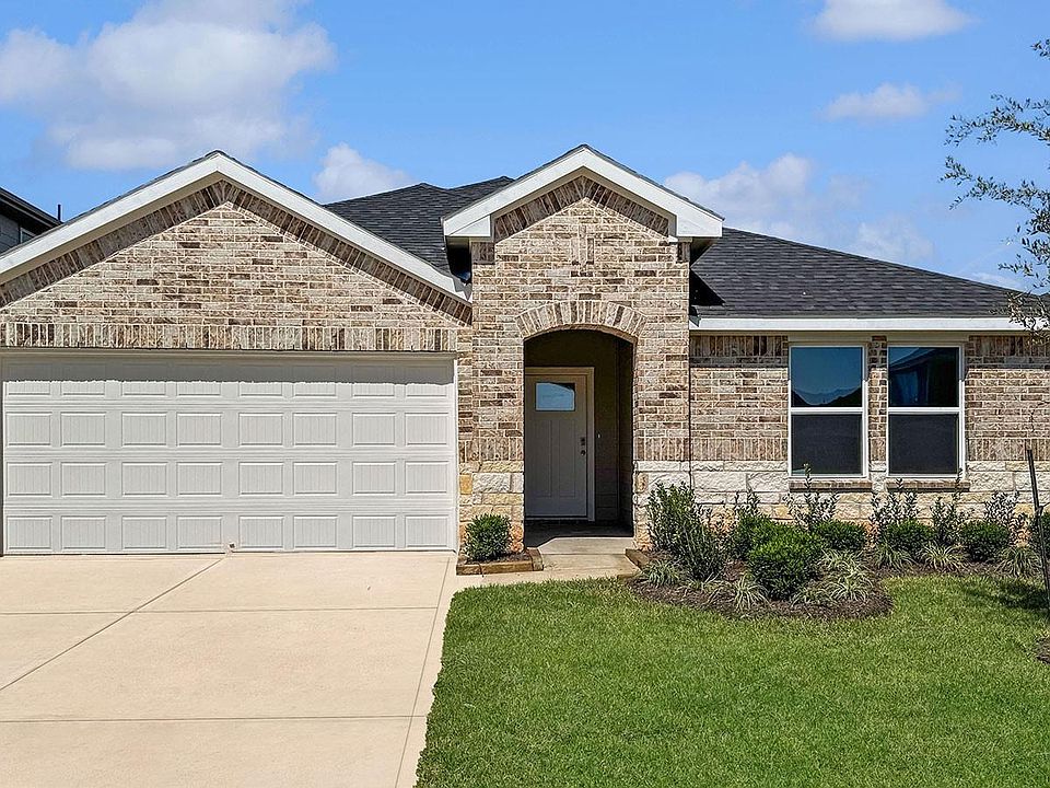 Welcome to D.R. Horton's Kingston Floorplan located in the beautiful community of Tamarron! With just over 2000 sqft, this 4 bedroom 2 bathroom home offers lots of unique features. The primary bedroom boasts a gorgeous sloped ceiling, as well as a spacious primary bath. The open concept living, dining, and kitchen area offers a kitchen island/ breakfast bar, waterfall granite countertops, and stainless steel appliances perfect for everyday use. The spacious living room leads directly to the back yard and covered patio, great for entertaining! Silversmith LVP flooring can be seen throughout the home. The exterior displays a beautiful traditional brick and stone face and 2 car garage. Tamarron is the place to be, with great community amenities and great location in the growing city of Fulshear! *Images and 3D tour are for illustration only and options may vary from home as built.