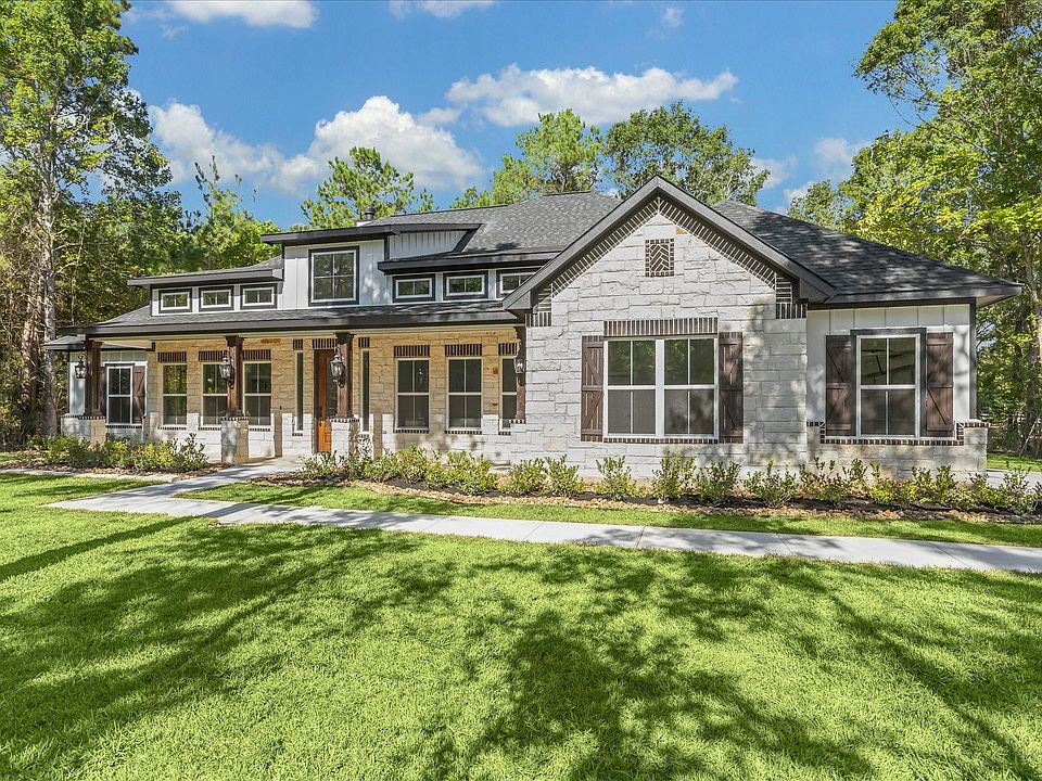 GORGEOUS NEW CONSTRUCTION HOME ON A LAKE 4 Bdrm 3.5 bath home on one acre in the popular gated community of Saddle Creek Forest. Impressive 20ft vaulted beam ceiling in the family room with floor to ceiling stone gas/wood fireplace. Beautiful island kitchen with quartz counters. Stainless Thor appliances. Gas cooktop. Shaker style cabinetry. 7ft long beautiful frameless shower enclosure and garden tub in the primary bath. Custom primary closet with built-in cabinets, drawers and drop down upper level hanging bar. Carpet in bedrooms. Ceramic wood look tile flooring. Secondary hall bath with double sinks. En suite bathroom in the fourth bedroom. Front of the home is fully landscaped. Rear perimeter grass sod. Covered back porch with ceiling fan. Home office with high ceiling and wall of windows, barn door entry. Home backs to the lake with clear views from the home common areas. Also next to a fenced community park with playground equipment. Covered entry with stained plank ceiling!