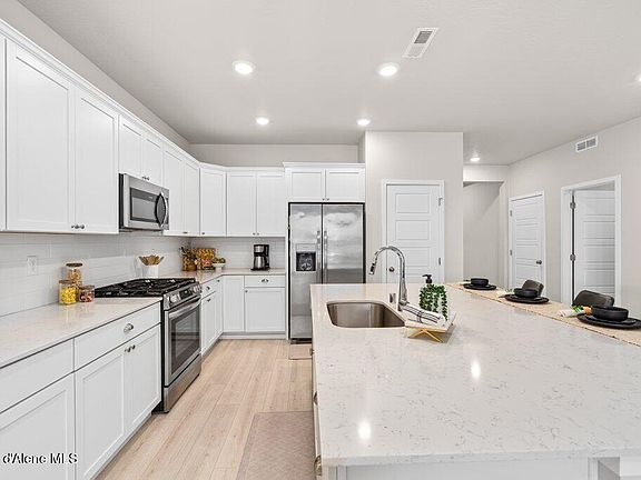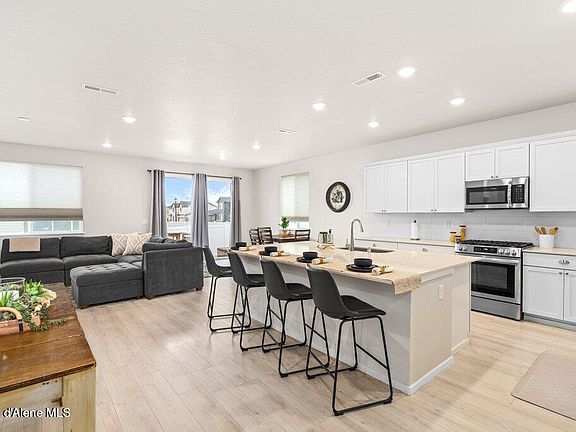 Recently built in 2023, this well thought out, single level north Idaho home is just the ticket! Comprised of 3 bedrooms, 2 bathrooms, 1674 sq feet, generous open concept dining/living/kitchen area, 9' ceilings, air conditioning and split bedroom floorplan. The spacious kitchen has an expansive 100''x66'' island, quartz countertops, stainless steel appliances and abundant storage, while the primary bedroom and amazing ensuite comes complete with double sinks, private water closet, low-threshold shower, and clothes closet large enough to share. Wide hallways throughout, allow for easy access around the home and a fantastic over-sized sliding glass door leads to the fully fenced backyard. Exterior of home includes custom rain gutters, covered front porch, 6'x3' garden shed and a landscaped yard with sprinklers front and back. All nestled on a premium corner lot close to schools and community parks. This is one fantastic home! *A local participating lender is currently offering a special incentive program for qualified buyers.
