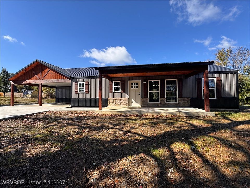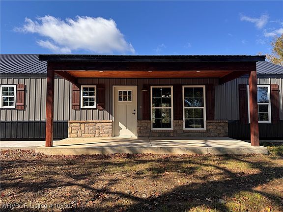 Welcome to this beautiful new construction barndominium like home located in Howe, OK. Estimated to be completed in 45 days (October 1st). The exterior douglas fir wood beams highlight the rugged beauty of this maintenance free bardo. The high efficiency on demand natural gas hot water tank helps keep utilities to a minimum. The entire house will be finished with vinyl plank flooring. With 3 bedrooms, two bathrooms, sitting on a spacious 3 lots totaling almost 0.75 acres, this property offers a perfect blend of modern comfort and natural beauty. The kitchen, dining, living area boasts vaulted ceilings making family gatherings comfortable and pleasing. The custom shiplap fireplace is the center piece for your relaxed evenings. This floor plan was designed to minimize any wasted space. The kitchen will be finished with a farmhouse sink, granite countertops & stainless steel appliances. The custom cabinets and pantry provide the space you need for all of your cooking supplies. The split floor plan has the additional 2 bedrooms along with the bathroom. The primary bedroom is a true sanctuary, complete with a walk-in closet and a luxurious ensuite bathroom with modern fixtures, a walk-in shower, and dual vanities. With the 3 spacious lots, this home provides ample outdoor space for various activities and enjoys the beauty of its location. Whether it's hosting gatherings, gardening, or simply enjoying nature, the yard offers endless possibilities. Conveniently located 15 minutes from Wister Lake. The Ouachita National are nearby for hunting, hiking, fishing & four-wheeling. The larger city of Fort Smith, AR is located 30 minutes away. This property is the ideal place to create lasting memories and enjoy a relaxed, comfortable lifestyle.
