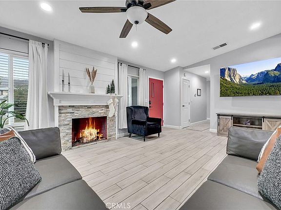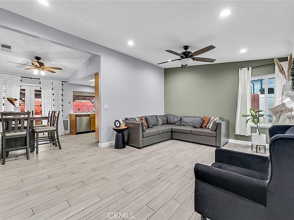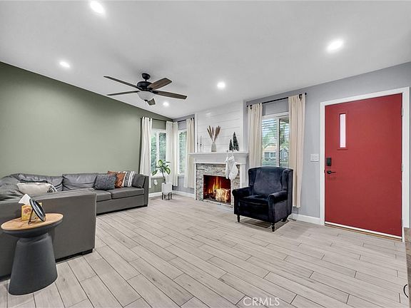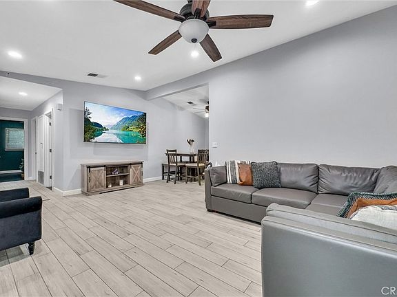Welcome to this beautifully updated 4-bedroom, 2-bathroom home, nestled on a quiet cul-de-sac, with open design and single-story living with no interior stairs. Vaulted ceilings, recessed lighting, custom flooring and modern finishes create a warm and inviting atmosphere. A spacious living area with updated fireplace & mantle opens to the adjacent dining area which flows seamlessly to the kitchen, featuring stainless steel appliances and a large garden window emitting natural sunlight. The primary retreat features cathedral ceilings, dual mirrored wardrobe closets and includes an en suite bathroom with custom lighting and beautiful, frameless shower with both standard and rain shower fixtures. French doors in both the primary bedroom and dining room open to the large, covered patio. The attached, oversized two-car garage includes laundry hookups along with ample room for an additional office space, bedroom or ADU with separate entrance. The extended driveway allows plenty of room for RV storage. Ceiling fans, blinds, and Milgard windows throughout. Conveniently located near schools, shopping, dining & entertainment, with easy freeway and Metrolink access, combined with low taxes and no HOA make this the perfect find!