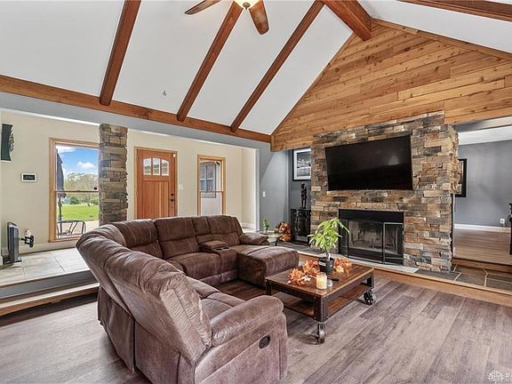 WOW! Contemporary Lodge Style is a MUST SEE with 4 Bed / 3.5 Bathroom + 2,600 sq/ft. Home Sits on 3 Acres in Bellbrook Schools! Huge 30x20 outbuilding with a loft + bar offers a fantastic space for a rec room, workshop, studio, PLUS extra storage has new windows. Large Vaulted Great Room with Oak Hardwood Floors, Beautiful Wood Beams, a Wood-burning FP, and French Doors out to the Back Patio! Oak Floors flows into the Dining Rm and Spacious Eat-in Kitchen which offers SS appliances, Granite Counter Tops, Center Island. Main Level Master Suite offers Ensuite. The second Floor offers a Second Master Suite Option with skylights- Full Bathroom and Walk-in Closets. Enjoy the Beautiful 3 Acre Lot, with Mature Trees and Privacy. Great Home with 2 Car Garage and Geo Thermal Heat. Recent Improvements - LVT Flooring - Stucco Siding - New Ceramic Walk-In Shower - Kitchen Upgrade.