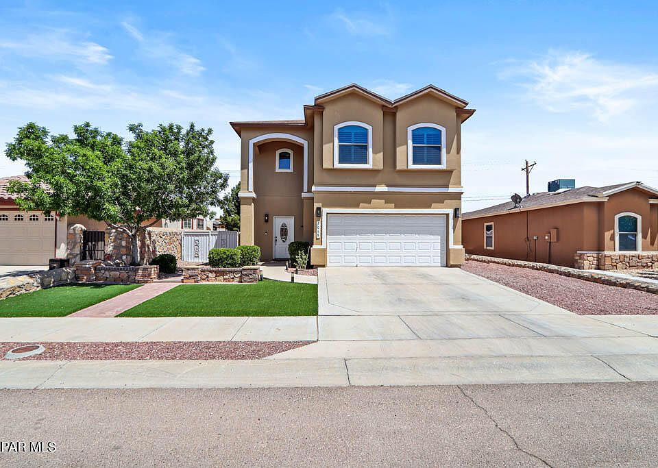 Nestled in the heart of the desirable Tierra del Este community in Far East El Paso, this beautiful 4 bedroom, 2.5 bath home offers comfort, space, and convenience. Located within the sought after Socorro Independent School District, this property features just under 2,000 square feet of open concept living space, perfect for modern lifestyles. The kitchen is the heart of the home, showcasing granite countertops, a ceramic tile backsplash, and a stainless steel appliance package. Upstairs, you'll find all four oversized bedrooms, providing plenty of space for rest and relaxation. Enjoy the low maintenance backyard, designed with rock landscaping and no dirt, the perfect blank canvas to create your dream outdoor retreat. Additional highlights include an assumable VA loan at a competitive 4.25% interest rate. This home combines functionality, style, and location, all in one of El Paso's fastest growing and most loved communities.