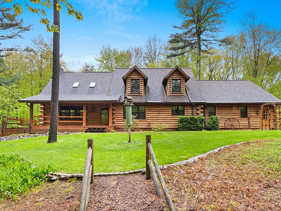 EVERYTHING YOU HAVE DREAMED OF! This LOG beauty is breathtaking featuring master bedroom on the main floor, open concept with towering log ceilings and tongue and groove along with panoramic views of secluded acreage, trees and wildlife The upstairs is complete with bedrooms, bath and extra loft areas and an office. All closets have quality custom organizers. This home has zoned heating, finished garage with epoxy floor ,cabinetry and running water. Yard equipped with a sprinkler system.The extra garage is sure to please. Driveway is stamped concrete. Gun safe in lower level included. This may just be the home you have been waiting for it has been well loved and cared for!
