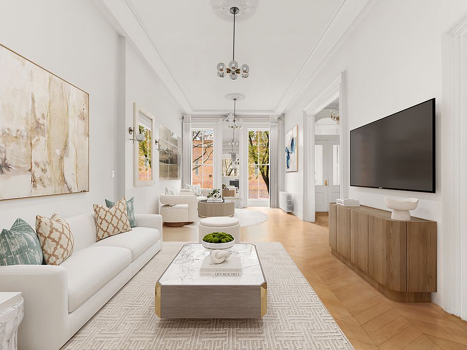 The garden level offers a full-floor media and entertaining space with direct access to the yard. The parlor floor features an updated eat-in kitchen with garden views, along with a gracious dining and sitting room. The upper floors provide flexibility with the potential for five bedrooms, or four oversized bedrooms plus a home office.