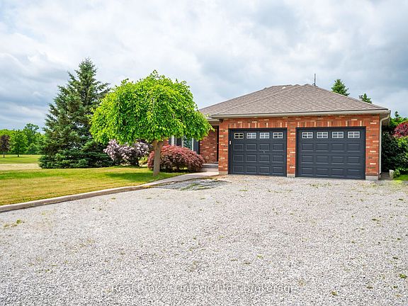An incredible opportunity awaits in this spacious all-brick bungalow set on a scenic 1-acre lot with ravine views on the banks of the Grand River. With over 2,500 sq ft of finished living space, this home offers a versatile layout ideal for multigenerational living, hobbyists, or investors seeking space and serenity with unmatched convenience. The main level features laminate and ceramic flooring, a large open-concept living and dining room, and a bright eat-in kitchen with ample cabinetry, a walk-in pantry, and walkout to a back deck and patio perfect for enjoying sunsets over the river valley or moonlight bonfires in your private oasis. The primary bedroom includes ensuite access to a stylish 3-piece bath with a walk-in tiled shower, while two additional bedrooms complete the level.The freshly finished lower level with in-law potential, is perfect for extended family or guests, with vinyl flooring throughout, a massive family room with gas fireplace, two oversized bedrooms, a 4-piece bath, and a large laundry/utility room. The massive driveway accommodates 8+ cars, plus a double car garage ideal for parking, storage, or a workshop in addition to the detached drive shed and garden shed. Located just minutes from Highway 403, this home offers fast, easy access to Brantford's full suite of big-box stores, restaurants, schools, and healthcare, as well as historic downtown Paris, known for its boutique shopping, cafes, riverside dining, and scenic trails. Whether commuting, exploring Brant County, or venturing further afield, this location is a true gateway to it all. Don't miss your chance to own this rare combination of space, setting, and location