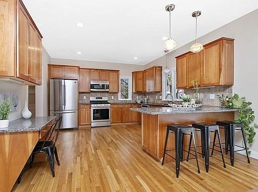 One of Needham's most desirable areas,this sunny home is close to Mitchell School and the high school.This contemporary New England Col. with its open floor plan and exceptional attention to detail will impress you from the front porch.The expansive entry leads to the heart of the home-a spacious gourmet kitchen with SS appliances, granite counters, cherry cabinets and a cozy breakfast bar.Flanking the kitchen are the classic DR with detailed wainscoting and the fireplaced family room-the perfect gathering spot.Glass sliders open to a private deck and fenced yard with mature trees-perfect for summer BBQs.A charming den and full bath with laundry complete the 1st floor. Needham Ctr is a short stroll away as are the train and library.2nd fl features a serene master with spacious walk-in closet and marble bath with soaking tub,glass shower and double vanity.3 family bedrooms and a crisp bath line the upstairs hall.Thelarge 5th bdr available as office/ playroom. Refinished basement!