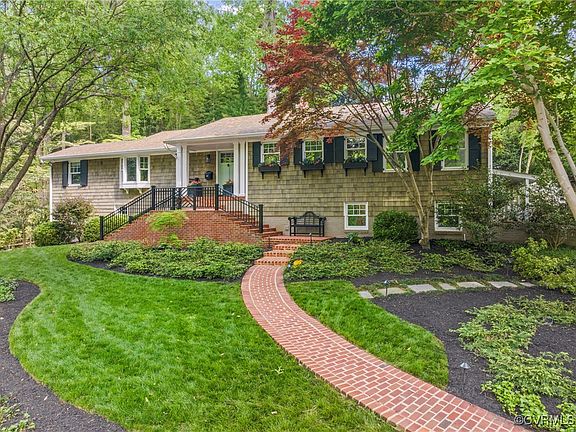Welcome home to this incredible storybook residence where traditional charm meets mid-century flair, offering truly one-level living! Discover this secluded gem on a prime lot in the highly sought-after Hillcrest neighborhood in Richmond’s near West End—just minutes from Cary Street Corridor and The Country Club of Virginia. Beautifully renovated with luxury and comfort in mind, this home showcases top-of-the-line finishes throughout. Step through an elegant archway into timeless, spacious, one-level living with a mid-century modern aesthetic. The home features all-new european white-oak hardwood floors across the entire main level. The gourmet eat-in kitchen is a chef’s dream with a Wolf gas range, built-in Sub-Zero refrigerator, quartz countertops, soft-close cabinetry, under-cabinet lighting, and island seating—perfect for daily living or entertaining. Host dinners in the formal dining room with its charming bay window, or unwind in the cozy living room, complete with a brick fireplace. At the heart of the home is a show-stopping family room with vaulted ceilings and stunning wall-to-wall casement windows equipped with remote-controlled shades for effortless light control. The main level includes a serene primary suite, two additional bedrooms, and two fully renovated baths featuring marble tile and striking finishes. A laundry closet, added in 2025, enhances main-level convenience, making it entirely livable without stairs. The fully finished basement offers a fourth bedroom, a second washer/dryer, a spacious rec room with built-in shelving, and direct access to a beautifully landscaped backyard. Enjoy the lush grounds from nearly every room. The backyard features beautiful landscaping lighting, a slate patio, firepit, and level play area—perfect for a swing set or garden. This exceptional property is a rare find. Don’t miss your chance to call it home!