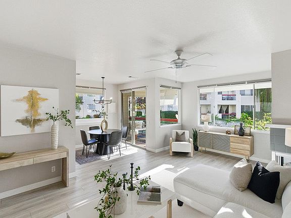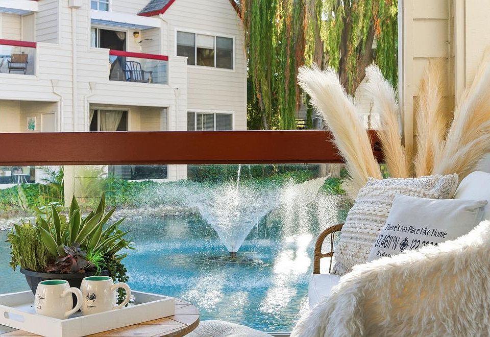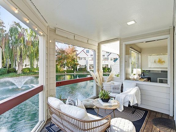 This beautifully updated 1-bedroom, 1-bath corner unit (approx. 860 sq. ft.) offers a serene escape surrounded by nature yet close to city conveniences. The standout feature is the wrap-around balcony overlooking a tranquil pond, perfect for morning coffee or quiet evenings. A private patio off the bedroom adds another relaxing outdoor space. Inside, enjoy luxury vinyl plank flooring, a partially renovated kitchen with updated cabinets, countertops, sink, and lighting, and an upgraded bathroom vanity with added storage. The spacious living area features abundant natural light and cooling cross-breezes that keep the home comfortable year-round. The peaceful setting changes beautifully with each season, with cherry blossoms, golden aspens, and wildlife including ducks, herons, and turtles. Community amenities include a pool, hot tub, sauna, and tennis courts, plus a detached one-car garage with extra storage. Conveniently located near Woodside Plaza, 280, and 101 for easy Peninsula living.