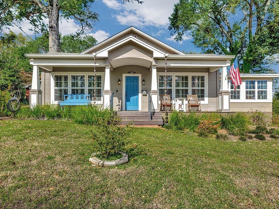 Step inside this 1,771 sq ft, three-bedroom, two-bath Craftsman-style home in northeast Nacogdoches, dating to the 1930s, where timeless charm meets modern updates. A full-length front porch welcomes you to a timeless elevation and view, setting the tone for the living experience inside. The home has been tastefully refreshed with hard-surface countertops and new appliances in the kitchen, plus remodeled bathrooms, yet it retains its classic appeal with hardwood floors and authentic Craftsman detailing. Bonus sunroom off the primary suite can double as an office or craft-room. The property sits on a generous 0.45-acre lot with a powered shop in the back, a two-car carport, and an inviting back patio perfect for evening dinners and relaxing after a long day. This blend of historic character and contemporary conveniences offers comfortable living, strong curb appeal, and accessible outdoor space for entertaining.