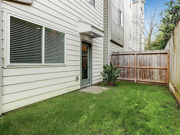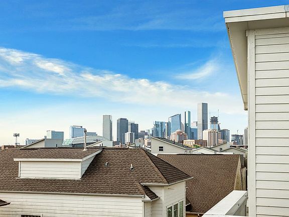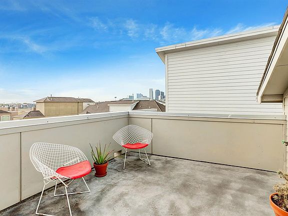 Outdoor living is a highlight, with a private backyard for gatherings and a rooftop terrace boasting dramatic Houston skyline views. The community includes a dog park and is located near Bruce Elementary, with quick access to downtown, restaurants, and entertainment.