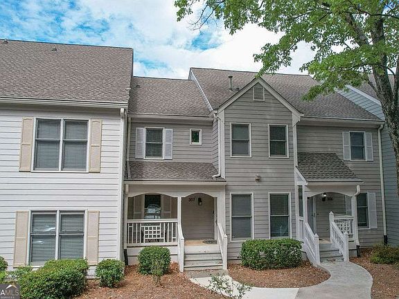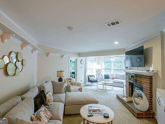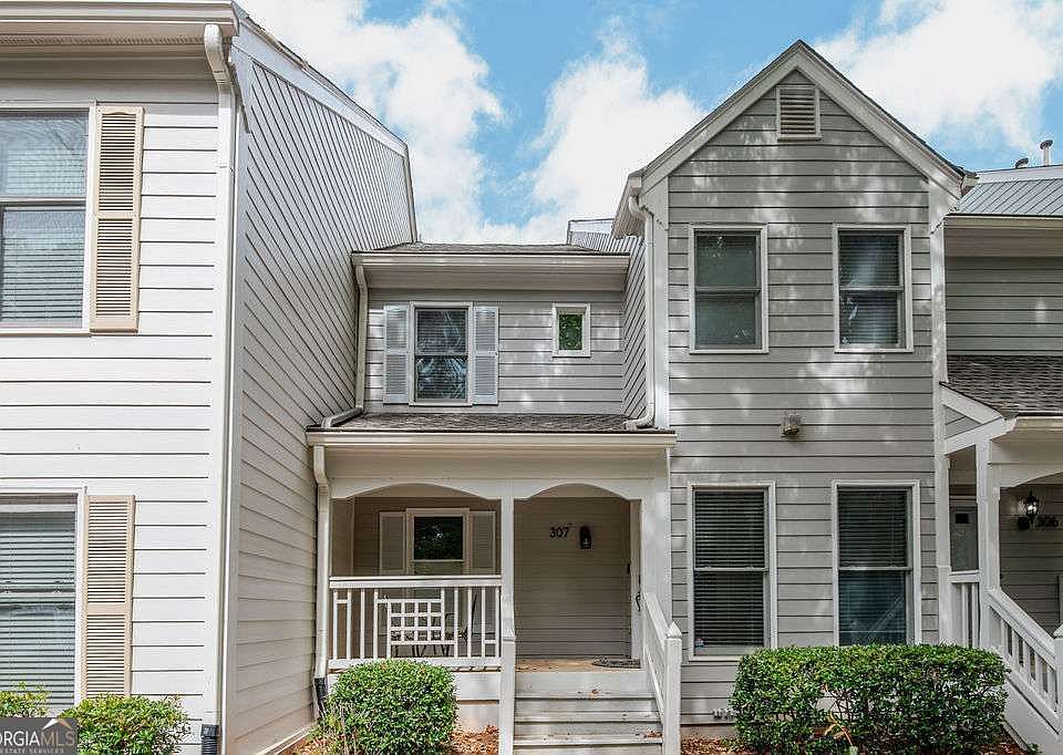 Welcome to 307 Hollyfax Circle in the desirable Oaks of Dunwoody community! This spacious 2 bedroom, 2 bath condo boasts one of the largest floorplans in the neighborhood and offers modern updates including new hard surface flooring. Step inside to a welcoming main level foyer with the perfect nook for shoes and coats. Upstairs, you'll find an inviting open concept layout featuring a living room with a brick fireplace and built-ins, an open dining area, and a sun-filled sunroom ideal for relaxing or entertaining.The well appointed kitchen includes granite countertops, stainless steel appliances, a double sink, ample cabinet and counter space, and a cozy breakfast nook with views of the dining and living areas. The private primary suite offers balcony access through elegant French doors, a walk-in closet, and a renovated ensuite bath with a beautiful tile shower and seamless glass enclosure. A second bedroom, full bath, and a spacious laundry room with extra storage complete the upper level. Additional storage is located on the lower level. Enjoy easy access to Perimeter Mall, GA-400, I-285, and nearby restaurants and amenities.