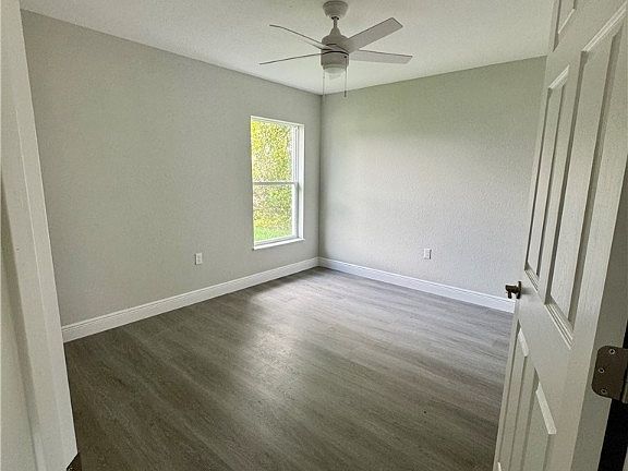Outdoor living is equally refined. The covered and screened lanai showcases coordinating stone tilework that echoes the front entry and is complemented by a modern ceiling fan, creating the perfect space to relax and enjoy Florida’s beautiful weather. The backyard offers ample room to personalize and enjoy, and an irrigation system is already installed for ease of maintenance.