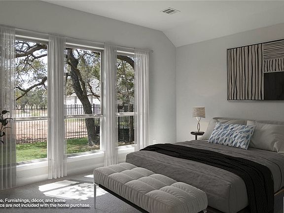 Extended entry with 12-foot ceiling leads to open kitchen, dining area and family room with 10-foot ceilings throughout. Kitchen features center island and walk-in pantry. Dining area and family room feature walls of windows. Primary suite includes bedroom with 10-foot ceiling and wall of windows. Double doors lead to primary bath with dual vanities, garden tub, separate glass-enclosed shower and walk-in closet. A guest suite with private bath adds to this spacious one-story home. Extended covered backyard patio. Two-car garage.