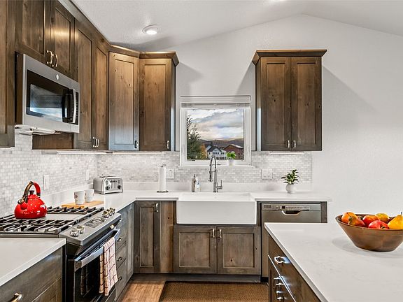 Welcome to this beautifully maintained four-bedroom, three-bath home in Hayden’s desirable Lake Village neighborhood. Built in 2018, this like-new 2,977-square-foot residence combines modern finishes with a thoughtful, functional layout just 20 minutes from Steamboat Springs and minutes from the Yampa Valley Regional Airport. This home is the perfect gathering place for family or friends with its attention to detail and gorgeous backyard space. A spacious entry and mudroom welcome you into the open main level, where the living room centers around a cozy fireplace and large windows frame views of the lake and surrounding hills. The kitchen features quartz countertops, a deep farmhouse sink, stylish backsplash, wood flooring, and quality stainless steel appliances including a gas range. Off the living room is a Trex deck for taking in the peaceful mountain and meadow views. Three bedrooms are conveniently located on the main floor, including the primary suite with an updated bathroom showcasing beautiful tilework and a stunning tub. The walkout lower level expands your living space with a large family room, a generous guest bedroom, a three-quarter bath, laundry room with an electric dog door, and a bonus game room perfect for entertaining. Step outside to a fenced, manicured backyard featuring a stylish pergola, organic garden, cherry and apple trees, a fire pit, a regulation horseshoe court and a 40' RV pad. The yard features a bird habitat and an irrigation system with seven zones. The organic garden has raised beds and drip lines to grow vegetables to your heart's content. Great curb appeal is the envy of the neighborhood complimented by blue spruce, young aspen and Canadian chokecherry trees. With an on-demand water heater, permanent holiday lights, forced-air gas furnace, fresh paint inside and out, and abundant storage, this home offers both comfort and an amazing outdoor area in a welcoming community with playgrounds, walking trails, and a lake at its center.