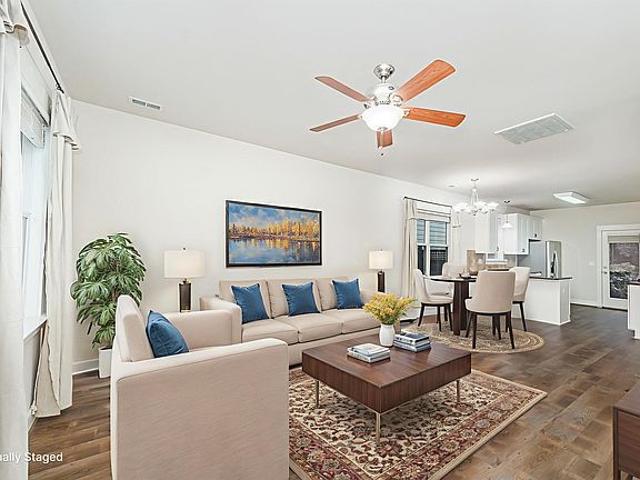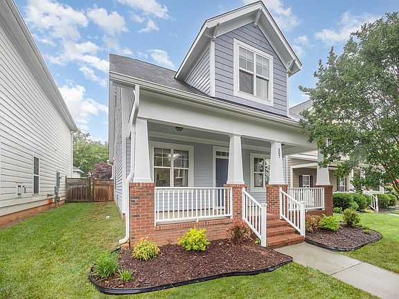 Step into timeless style and modern comfort in this move-in-ready home in popular Powell Place. From the welcoming front porch to the thoughtfully updated interior, this home is filled with warmth & charm. Inside, you'll find new flooring, fresh paint, and brand-new carpet, all complemented by 9-foot ceilings and an open-concept layout that's perfect for everyday living. At the heart of the home, the updated kitchen features crisp white cabinetry with soft close, granite countertops, stainless steel appliances, a gas range, & tile backsplash. Two bedrooms located on the main level, while the upstairs offers a private retreat in the primary suite, complete with en-suite bath and a walk-in closet. Generous storage throughout, including multiple closets and walk-in attic space. Outside, enjoy a fenced backyard, ideal for pets, play, or entertaining. Alley access to a detached, insulated, two-car garage wired with a 220V outlet that adds flexibility for hobbies, EV charging, or a workshop. Located minutes to downtown Pittsboro, you can commute to Chapel Hill, Apex, and RTP. Don't miss your chance to own this thoughtfully updated gem that delivers comfort, convenience, and community.