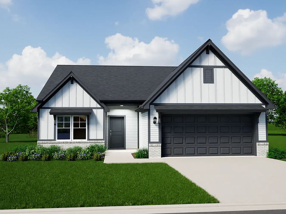 Welcome home to the Bradford, a thoughtfully designed single-story floor plan offering 3 spacious bedrooms and 2 full bathrooms. This home's Elevation E with Brick Option A creates timeless curb appeal, complemented by Dover White siding and Tricorn Black trim for a striking exterior contrast. Step inside to 9-foot ceilings and an inviting great room with a gas fireplace, perfect for cozy gatherings. The modern kitchen features 42-inch cabinets, 3 cm granite countertops, a large island, and stainless steel appliances-ideal for everyday living and entertaining alike. The primary suite includes a double bowl vanity, adding function and luxury to your daily routine. A 2-car attached garage completes this beautiful, move-in-ready home designed with comfort and style in mind.