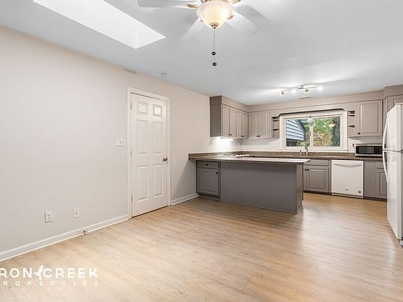 This four-bedroom, two-bath home features a flexible floor plan with hardwood and luxury vinyl plank flooring throughout. The kitchen is outfitted with a refrigerator, electric wall oven, separate electric cooktop, dishwasher, and offers abundant granite counter space in a convenient u-shaped layout. The living area includes a propane gas log fireplace and skylights that enhance natural lighting. A versatile intermediate room provides space for a home office, dining area, or den.