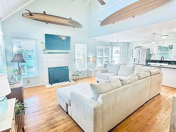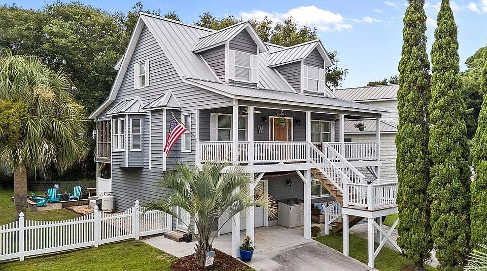 Charming 4-bed, 3-bath coastal home in Emerald Isle offering timeless beachside appeal and a light, airy aesthetic. Enter from the welcoming front porch—perfect for morning coffee and ocean breezes—into an open-concept great room where vaulted ceilings and abundant natural light create a bright, airy gathering space. The versatile flex room adapts easily to a home office, guest suite, gym, or studio. Step outside to the private back porch and spacious patio—ideal for entertaining or quiet afternoons with friends and family. Thoughtful coastal finishes throughout make this residence a relaxed, ready-to-enjoy retreat for island living. All this on an elevated lot 20+ feet above sea level (no flood insurance required).