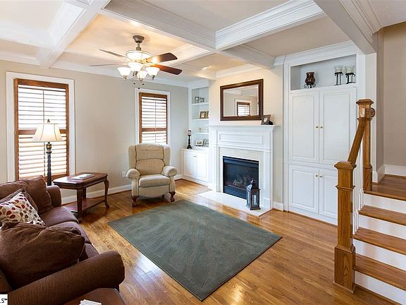 Charming is an understatement for 307 Oxner Rd in the pedestrian friendly, neo-traditional community of Redfearn in Simpsonville. Custom touches are plentiful throughout from the thick crown moldings, the coffered ceiling and custom built-ins in the great room to a corner cabinet in the dining room/parlor area. Plus this home has one of the most flexible floor plans one could want! There's a master suite on the main level AND upstairs! The main level master features two walk-in closets and full bathroom with jetted tub, sep shower and double sink vanity. Upstairs, you'll find the second master suite with its own deck overlooking the community's Central Park area. This room has a spacious bathroom with a tub/shower, large vanity with a single sink. Also upstairs are two additional bedrooms with a connecting bathroom. The 4th bedroom could also serve as the home's bonus/recreation space given its mass. Let's not forget the galley style kitchen with solid surface countertops, 42 inch stained cabinetry and a cozy breakfast area showcasing some of the home's richly stained plantation shutters. There are also TWO washer / dryer connections in the home, one off the downstairs guest bath/powder room AND upstairs in the home's walk-in attic storage area. Blinds and Shutters throughout. Freshly painted, neutral interior throughout. All of the bathrooms feature tiled flooring and accents. Hardwoods grace the main level including the master bedroom. The home offers various places to enjoy the outdoors from the double side porches to the brick paved side courtyard with fencing and access to the two-car rear load garage and alleyway. Redfearn is convenient to downtown Simpsonville, Hwy 14 and Five Forks Simpsonville. The community boasts a large Central Park and playground.