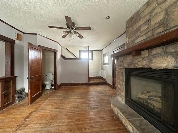 Open front porch, large detached garage, hardwood floors and natural woodwork throughout. Usable basement. Home sold in current condition.