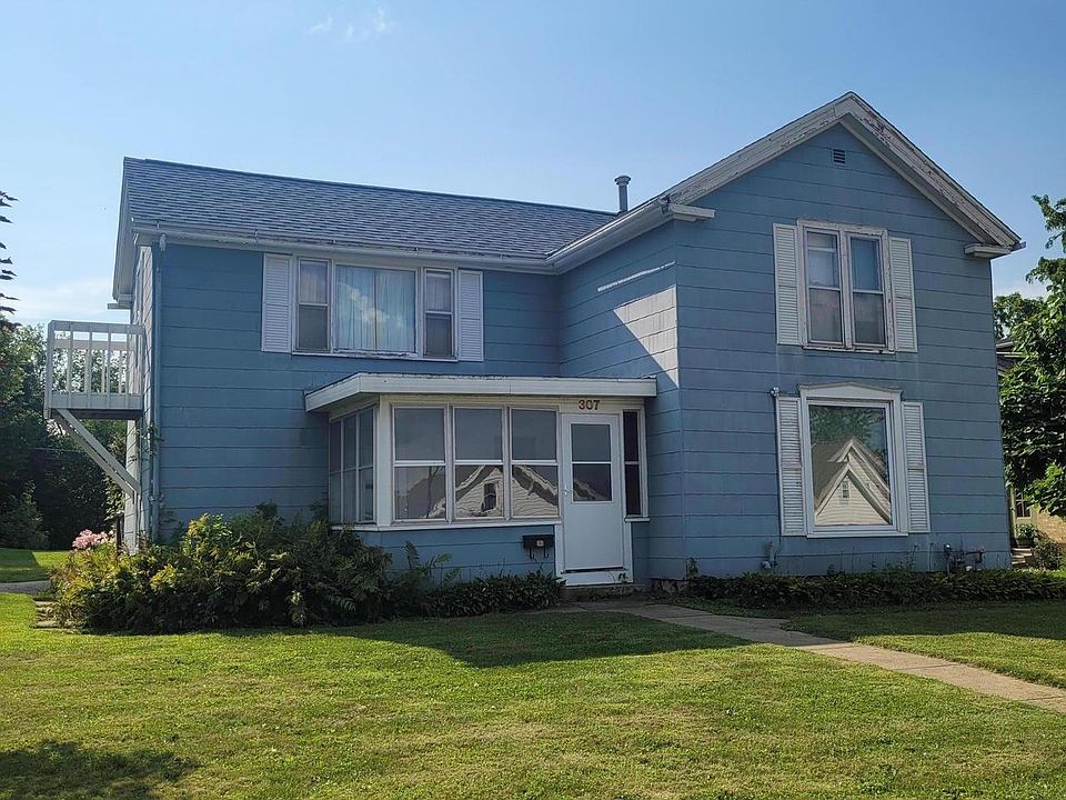 Over 1/2 Acre lot in the center of the city of Lake Mills. This home has lots of potential for a 3 bedroom single family home or a duplex with 1 bedroom each. First floor has a large eat-in kitchen plus formal dining room. First floor laundry and storage room off kitchen. 2 enclosed porches for the cool evenings. Extra deep lot is over a half an acre with a large 2 car detached garage. Doors are high enough for taller vehicles. Upstairs needs renovations to kitchen and bathroom.