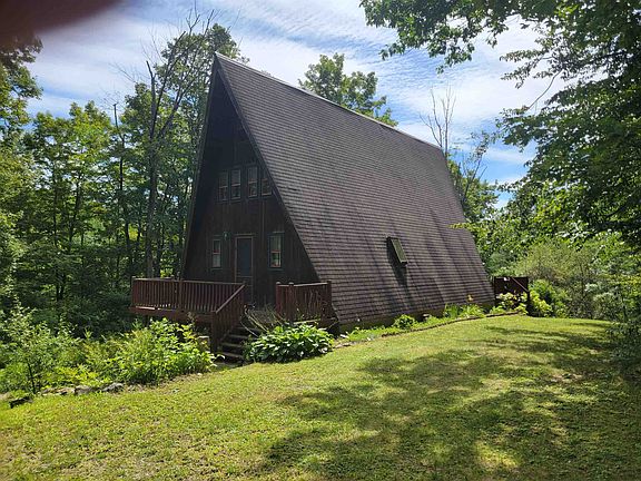 Whether this property will be a primary home or a vacation home, you may well appreciate the country setting and the privacy surrounding the dwelling. With high ceilings, the wood beams and the living room glass doors leading to the deck, the living room, with a dining area, lends itself to a comfortable and light filled area. Open kitchen. First floor has a full bath and bedroom. Second floor includes two bedrooms and a walk-in closet. Central vac. There is a basement with its access from outside. Stone walls. Shed. The land is both level and open and slightly rolling into woods. A stream is on the of the property. Property is being sold furnished except for items of a personal nature. The property is in close proximity to the main road, Interstate 91, and the NH line. Let's look at it!